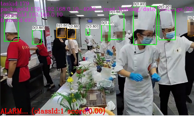 鯤云科技“算力+算法+平臺”一體化的AI視頻分析解決方案配備十余項專為明廚亮灶場景打造的AI算法,將后廚烹飪、清洗消毒等重點區域、重要環節的違規數據實時上傳到明廚亮灶監管平臺,通過 AI 算法 7×24 小時智能識別抓拍后廚人員是否規范穿戴、鼠患活動、動火離人等情況,并提醒相關管理人員,形成 " 智能發現 - 實時預警 - 閉環處置 " 的快捷響應和管理鏈路。